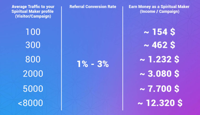 There is no limit to how much you can make! The average Spiritual Maker conversion rate is 1-3%, this means 1-3 purchases per 100 visitors. Here are the numbers that we pay for every product sold: Vitality Indicator: 30 USD, Egely Wheel: 80 USD, Vitality Pack: 100 USD.